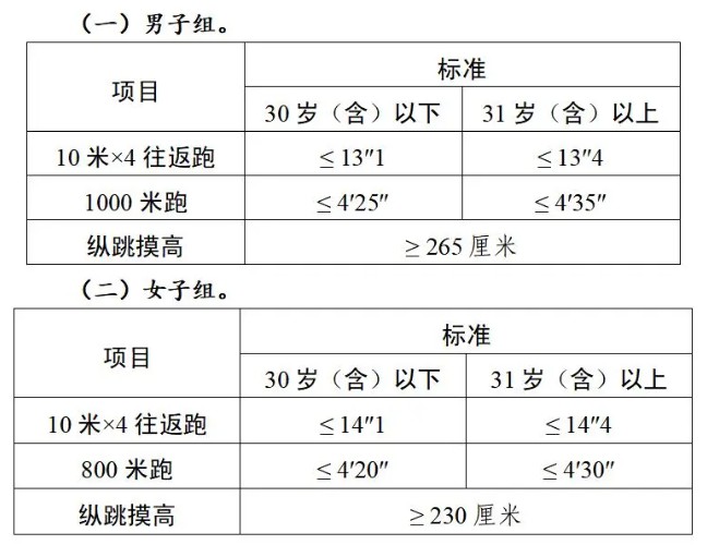 體能測評三項全部達標方為合格。報考緊缺職位的人員,體能測評三項中有二項達標的,視為合格。其中:縱跳摸高的測試次數不超過(guò)3次,10米×4往返跑的測試次數不超過(guò)2次,1000米跑/800米跑的測評次數為1次。