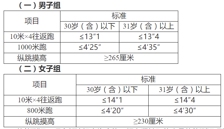體能測評三項全部達標方為合格。報考緊缺職位人員體能測評項目三項中有兩項達標的,視為合格。體能測評項目中,縱跳摸高項目的測評次數不超過(guò)3次,10米×4往返跑項目的測評次數不超過(guò)2次,男子1000米跑、女子800米跑項目的測評次數為1次。