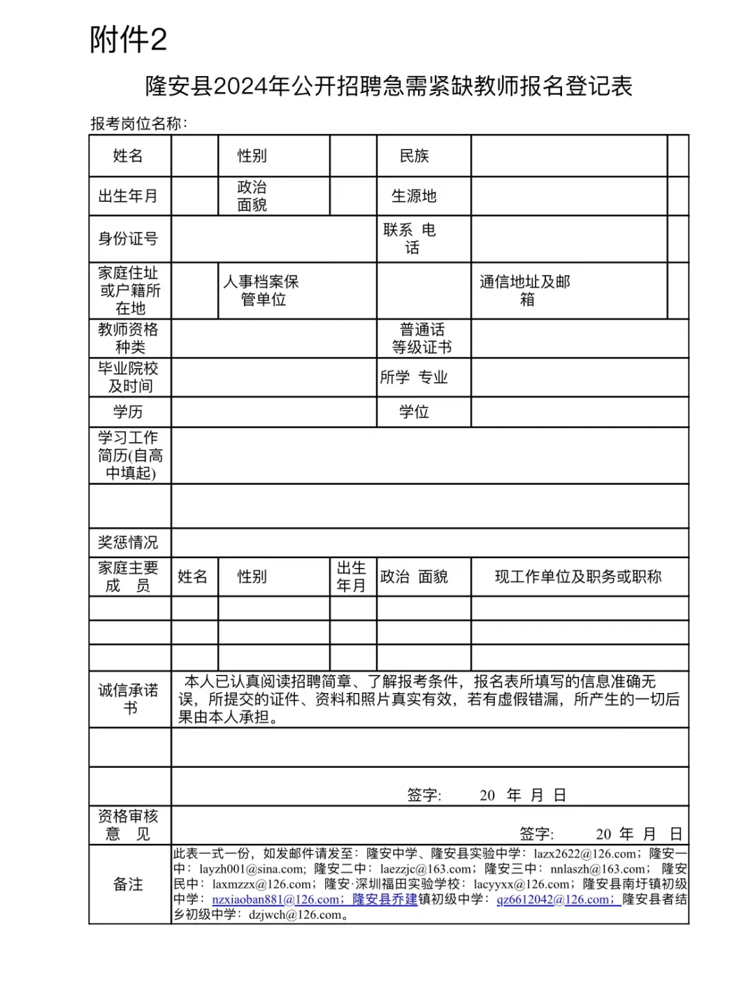 (1)“隆安縣2024年公開(kāi)招聘急需緊缺教師報名登記表”電子版??傻卿洀V西南寧市人力資源和社會(huì )保障局網(wǎng)站、廣西南寧市隆安縣人民政府門(mén)戶(hù)網(wǎng)站、隆安縣民族中學(xué)微信公眾號下載。