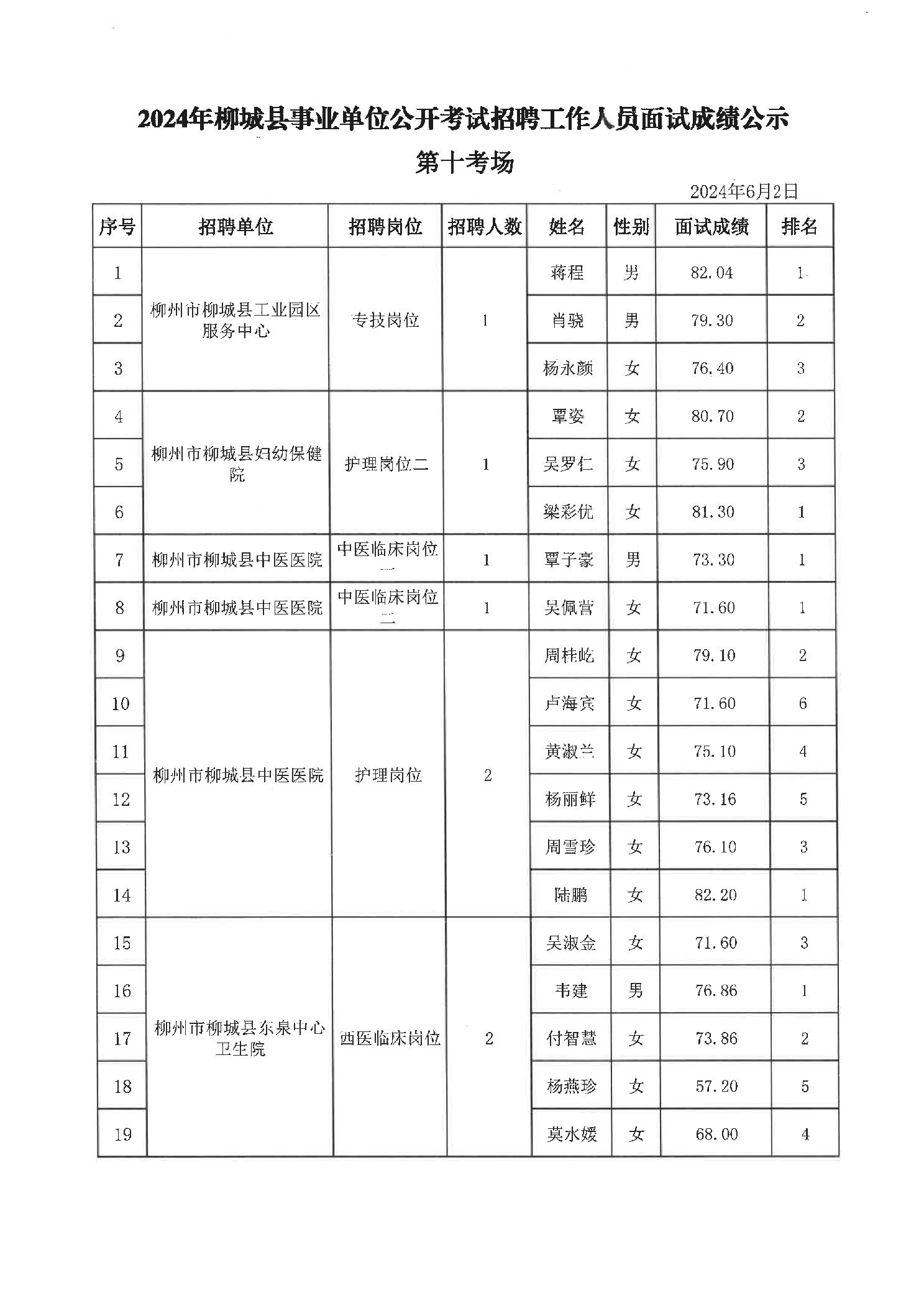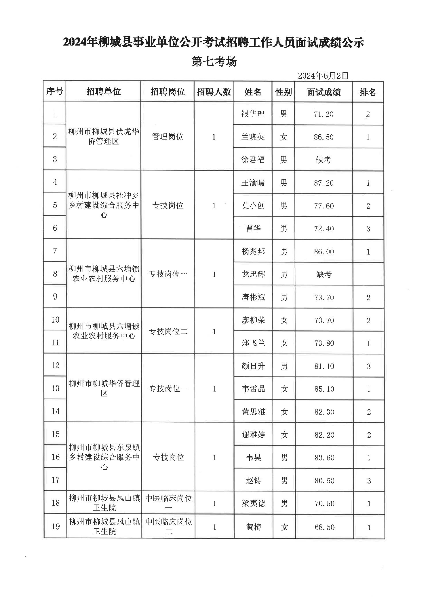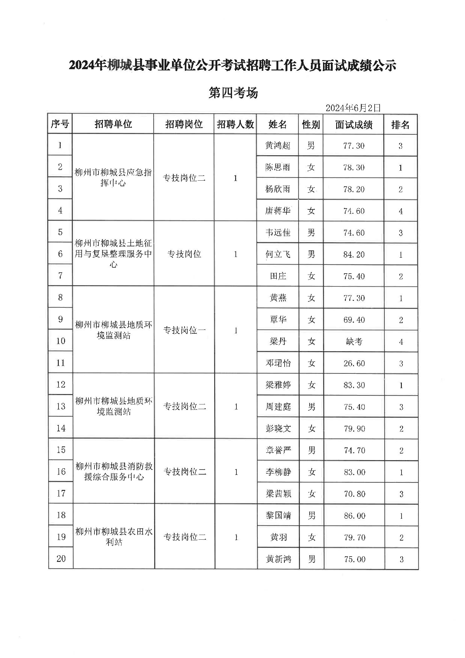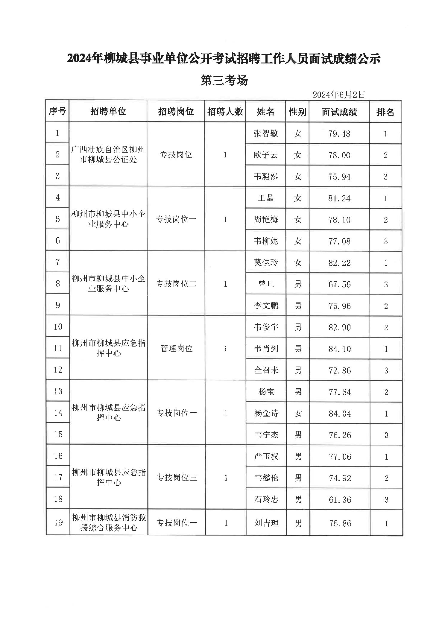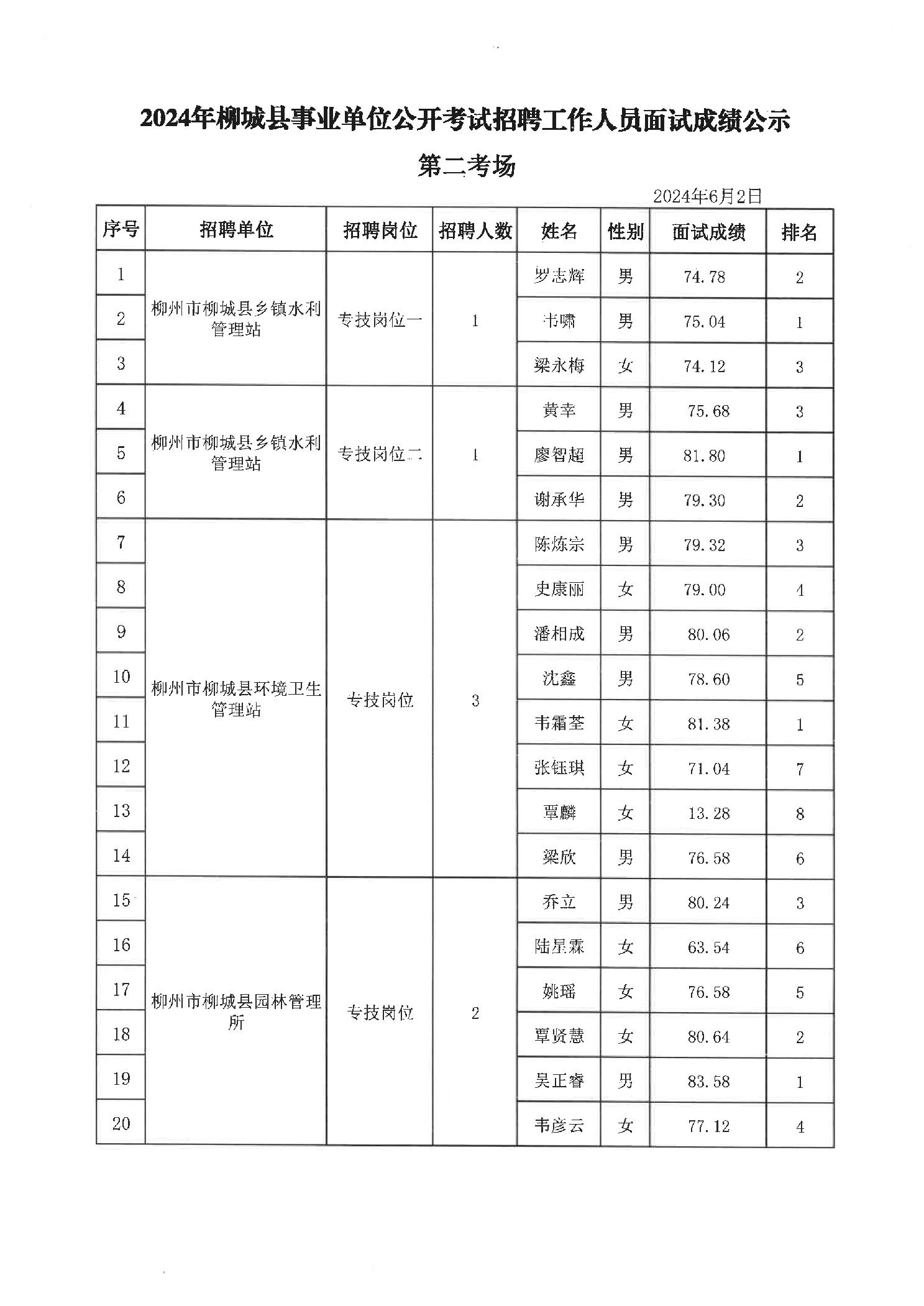 原文標題:2024年柳州市事業(yè)單位公開(kāi)考試招聘工作人員面試成績(jì)公示(柳城縣崗位)