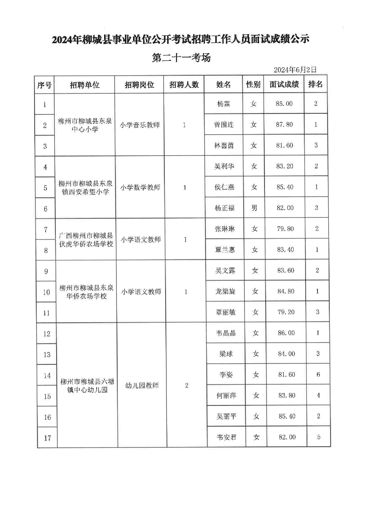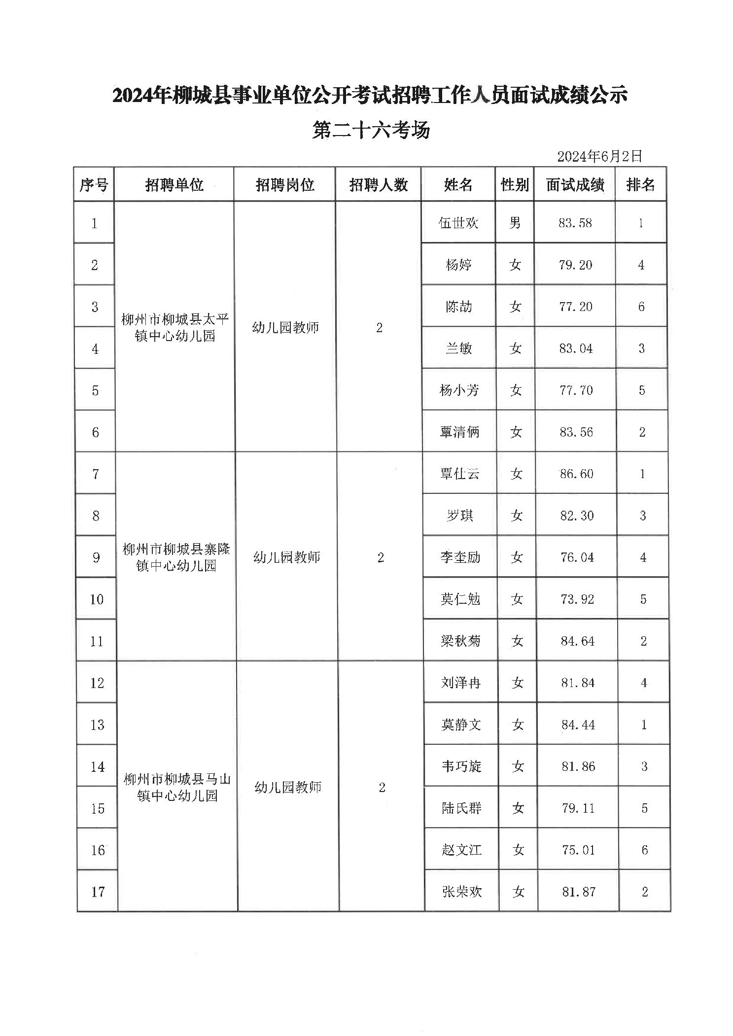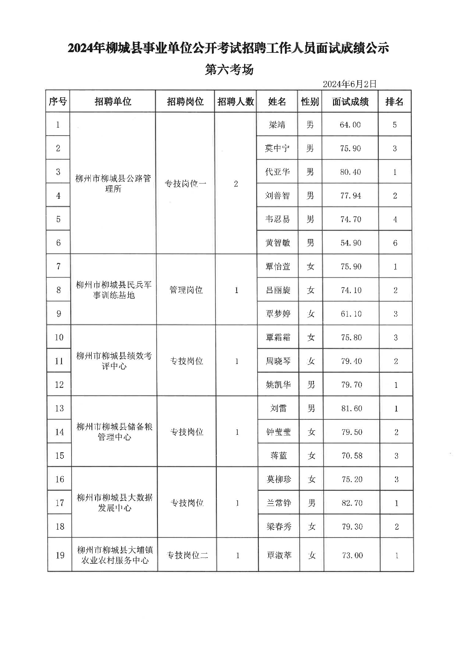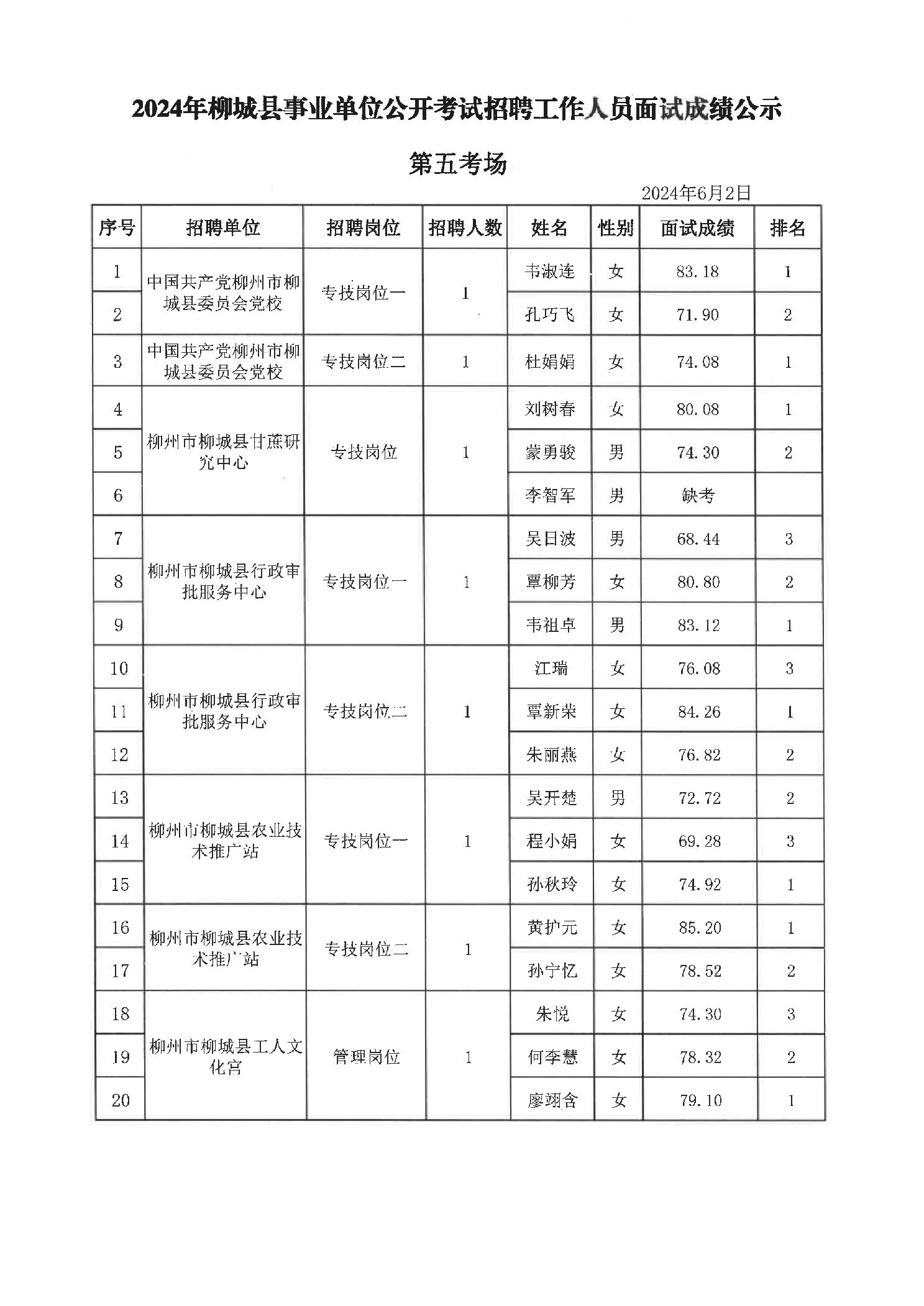 2024年柳城縣事業(yè)單位公開(kāi)考試招聘工作人員面試成績(jì)公示