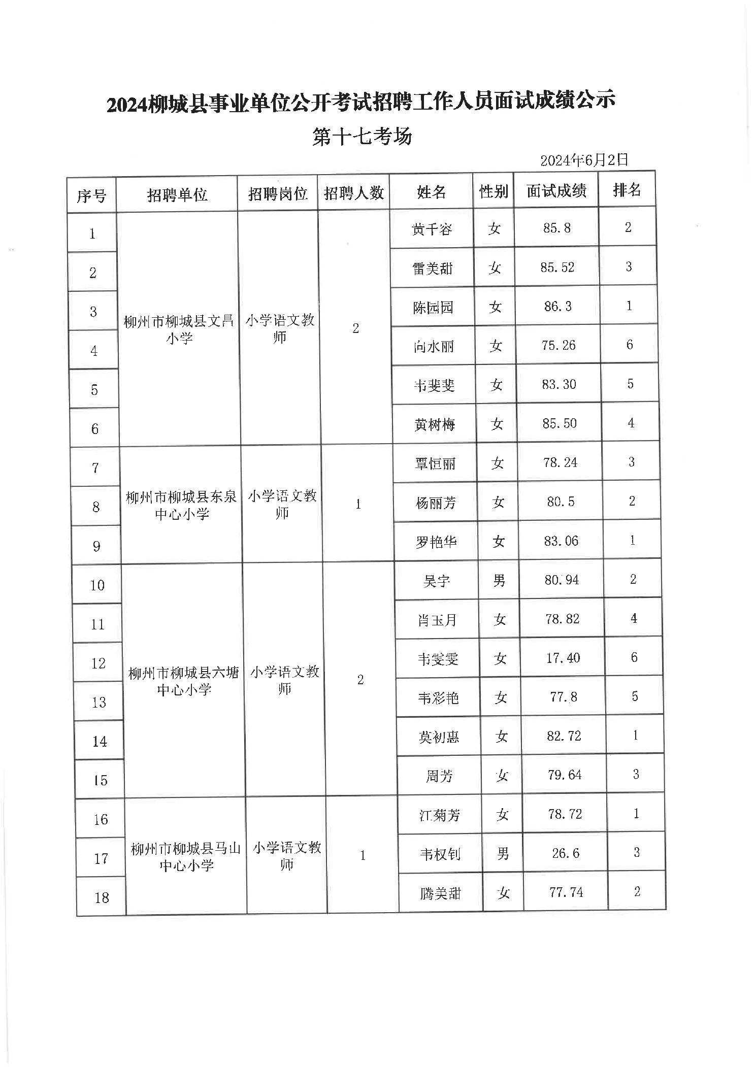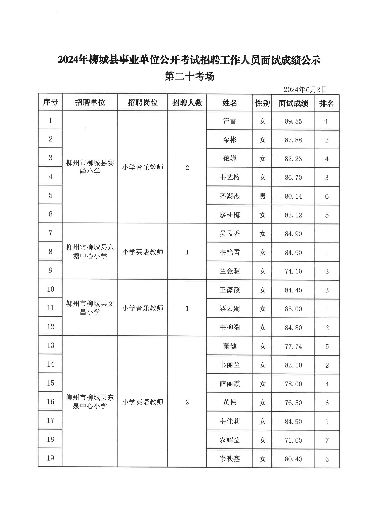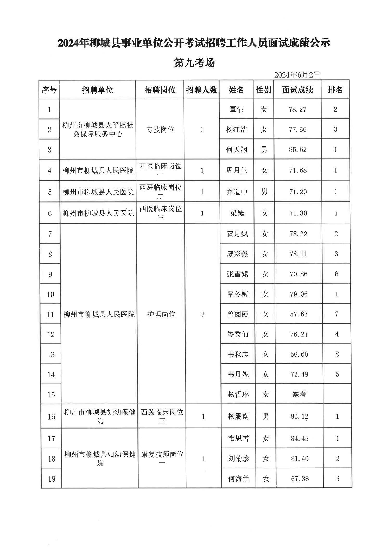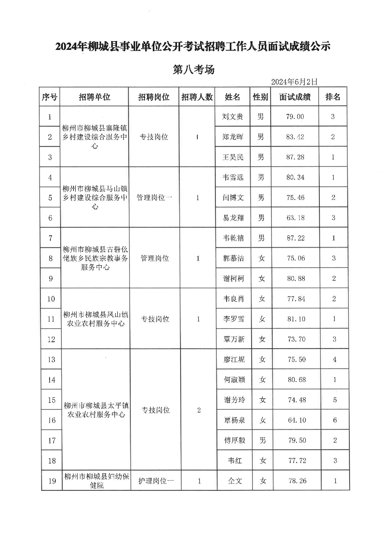 2024年柳城縣事業(yè)單位公開(kāi)考試招聘工作人員面試成績(jì)公示
