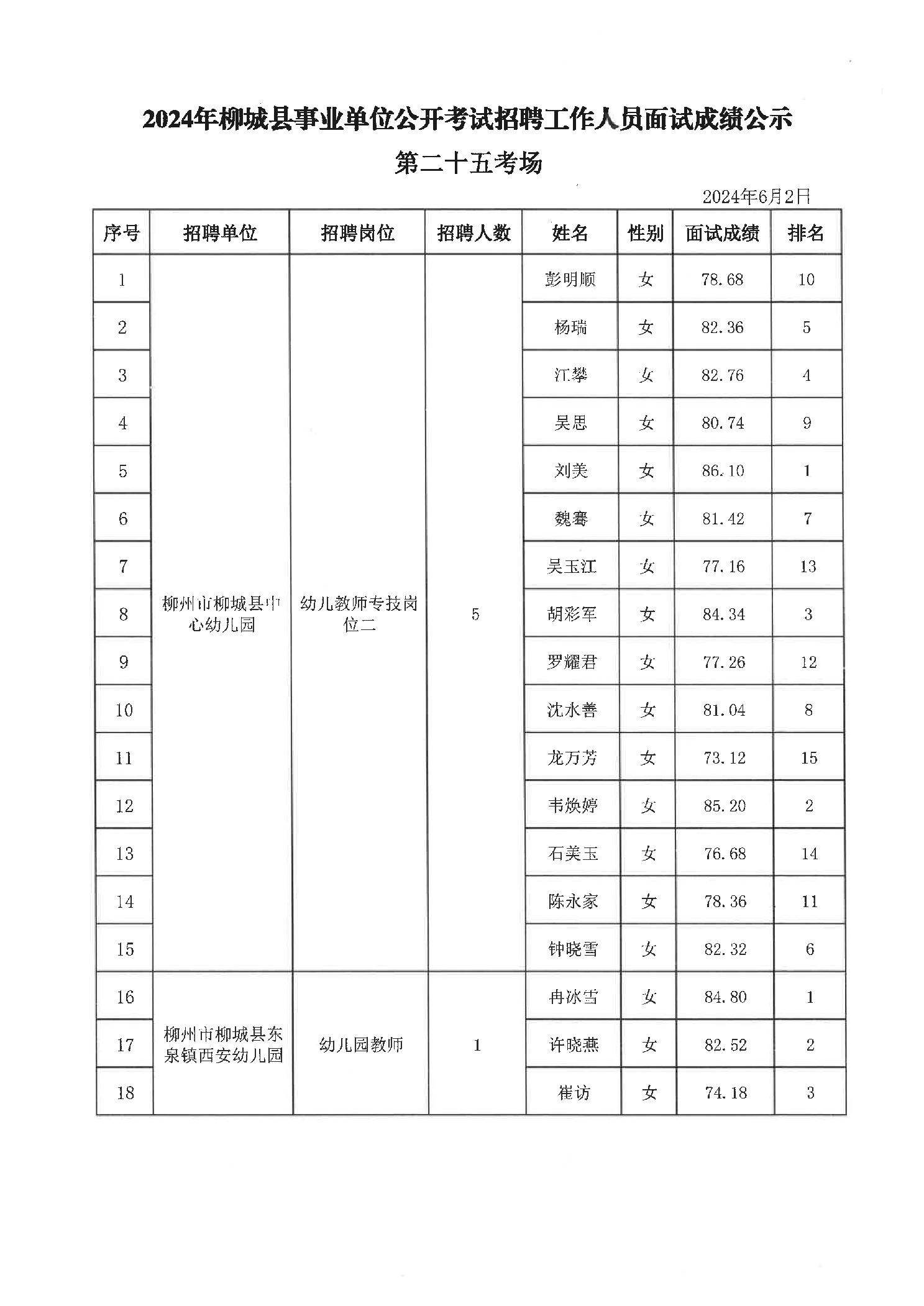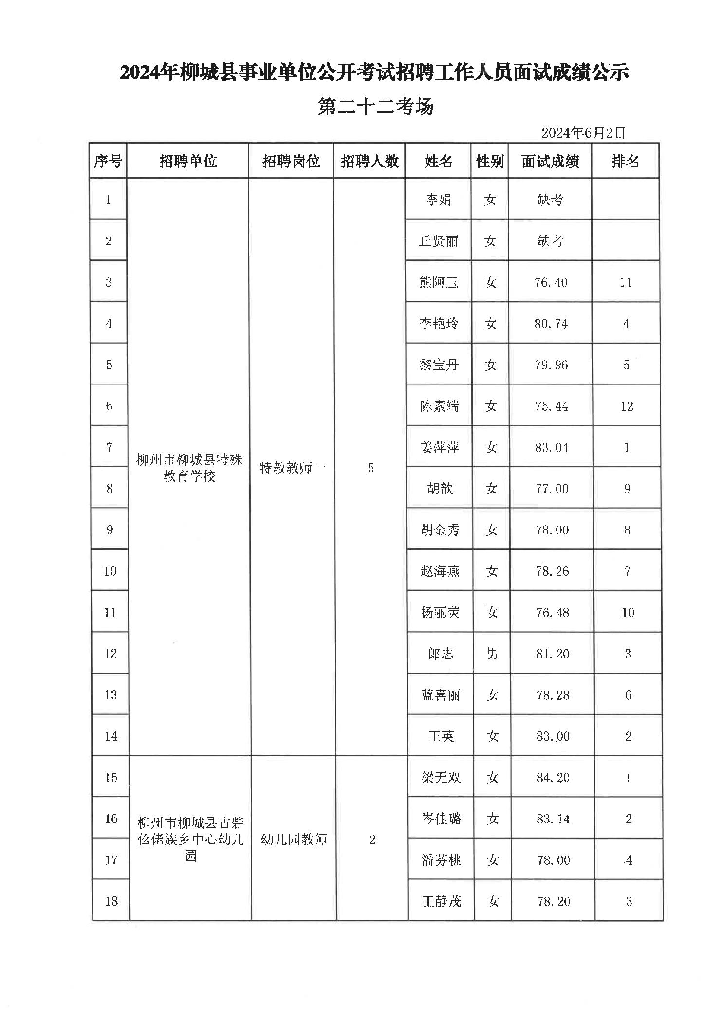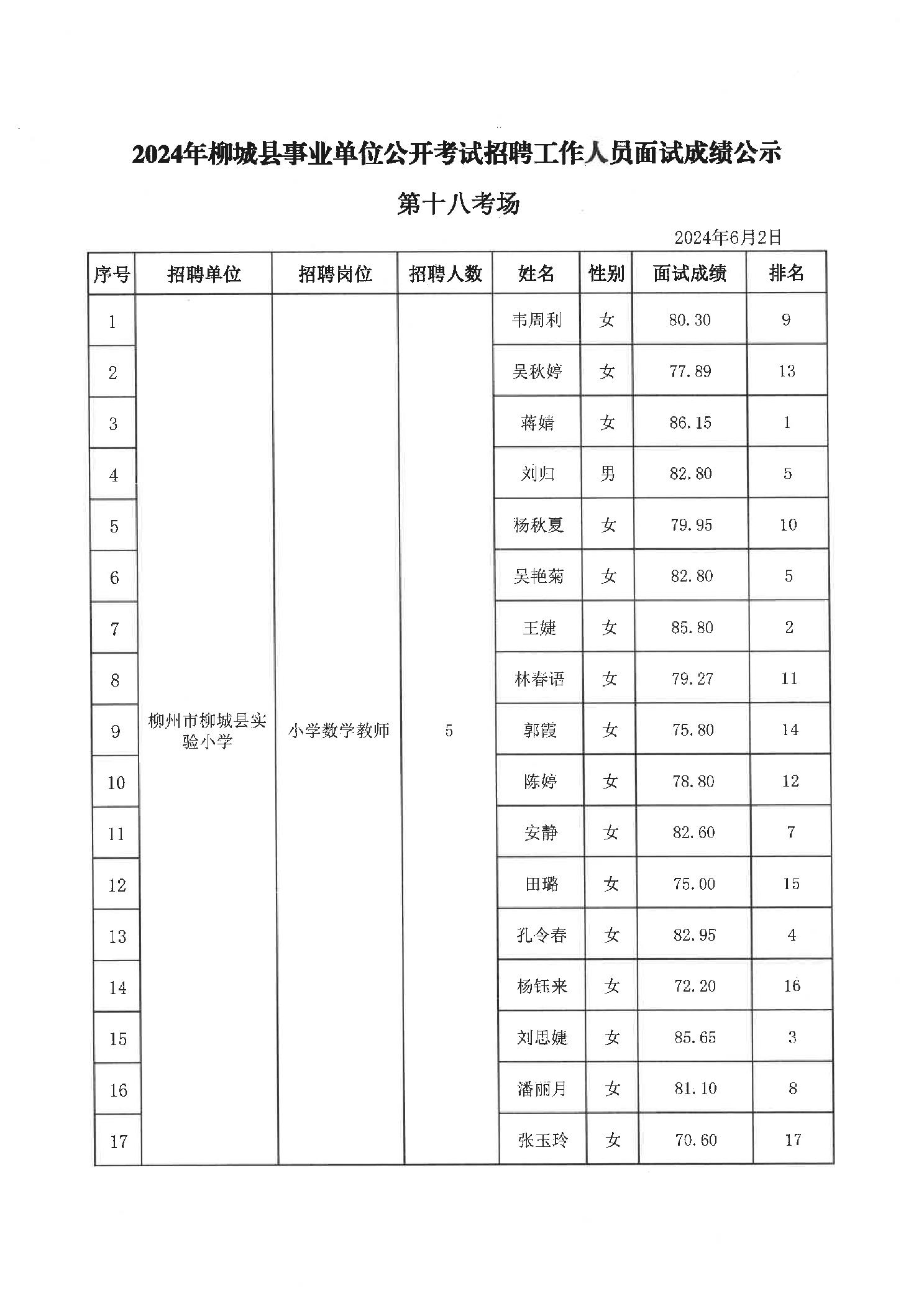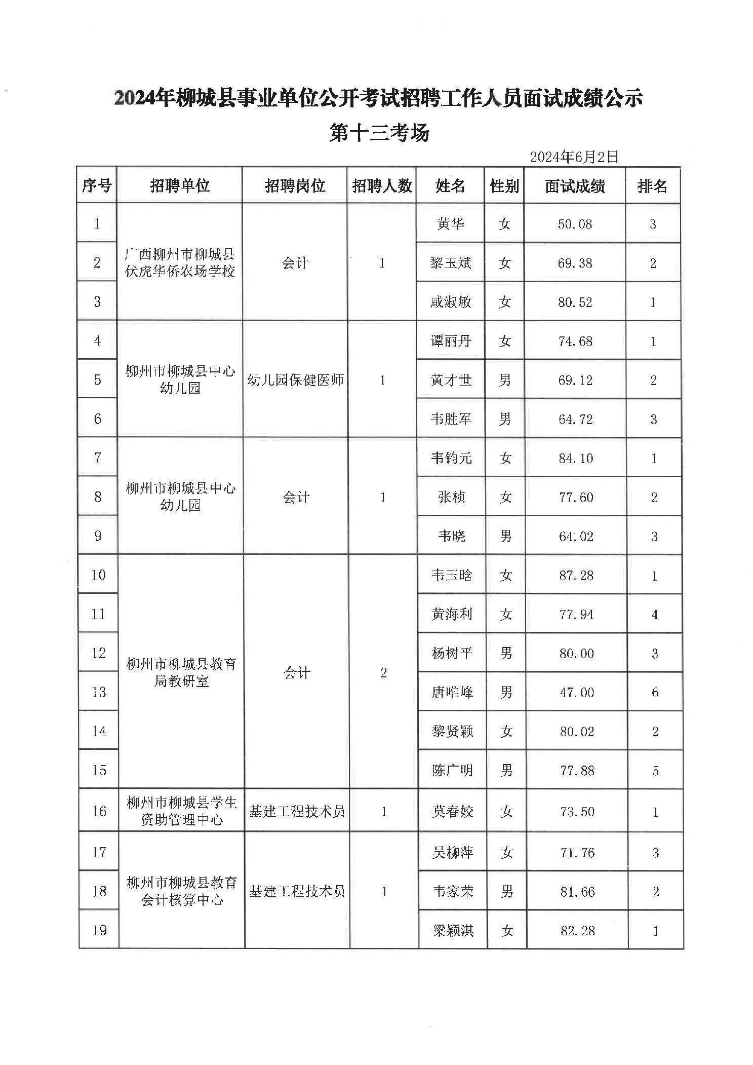 2024年柳城縣事業(yè)單位公開(kāi)考試招聘工作人員面試成績(jì)公示