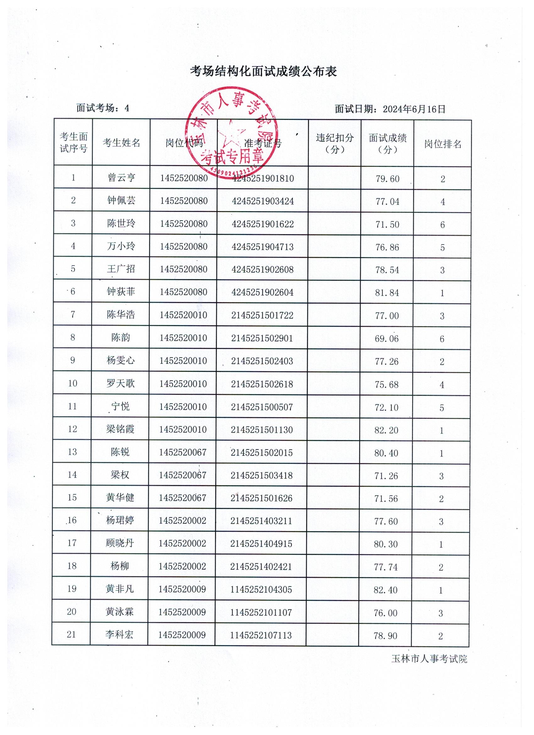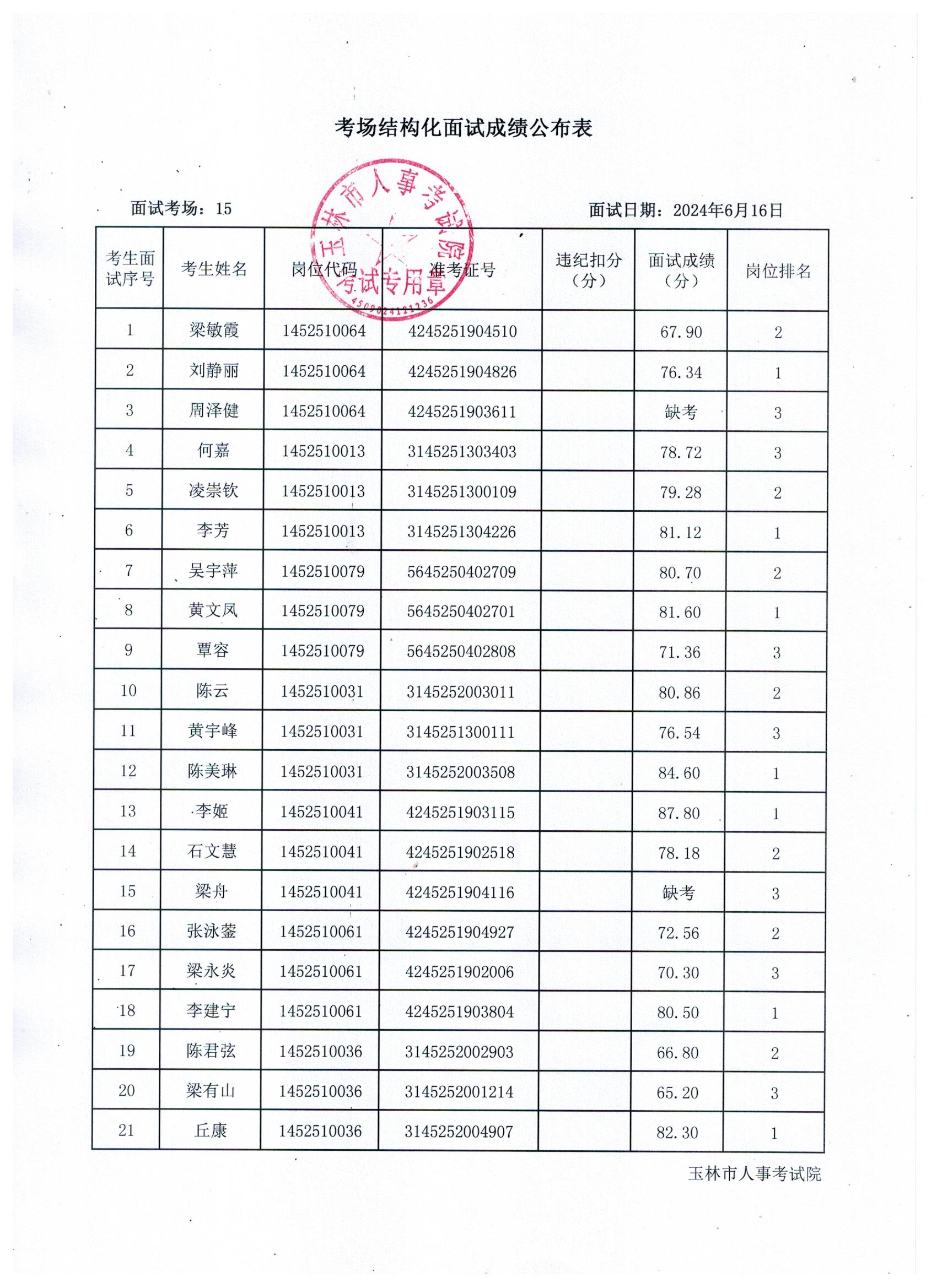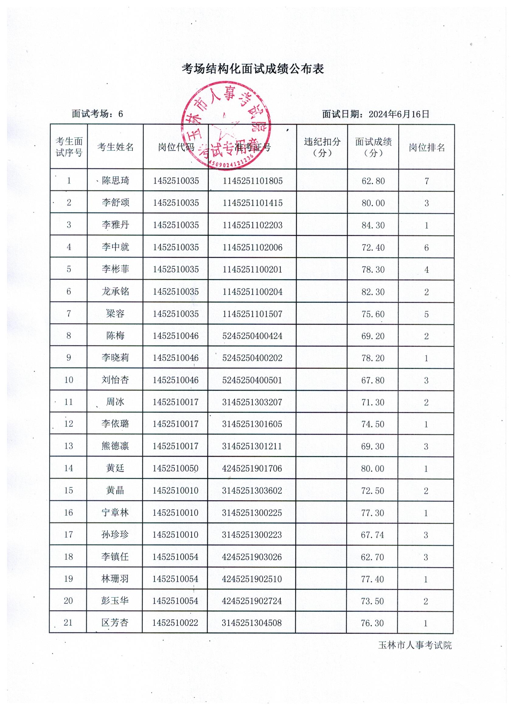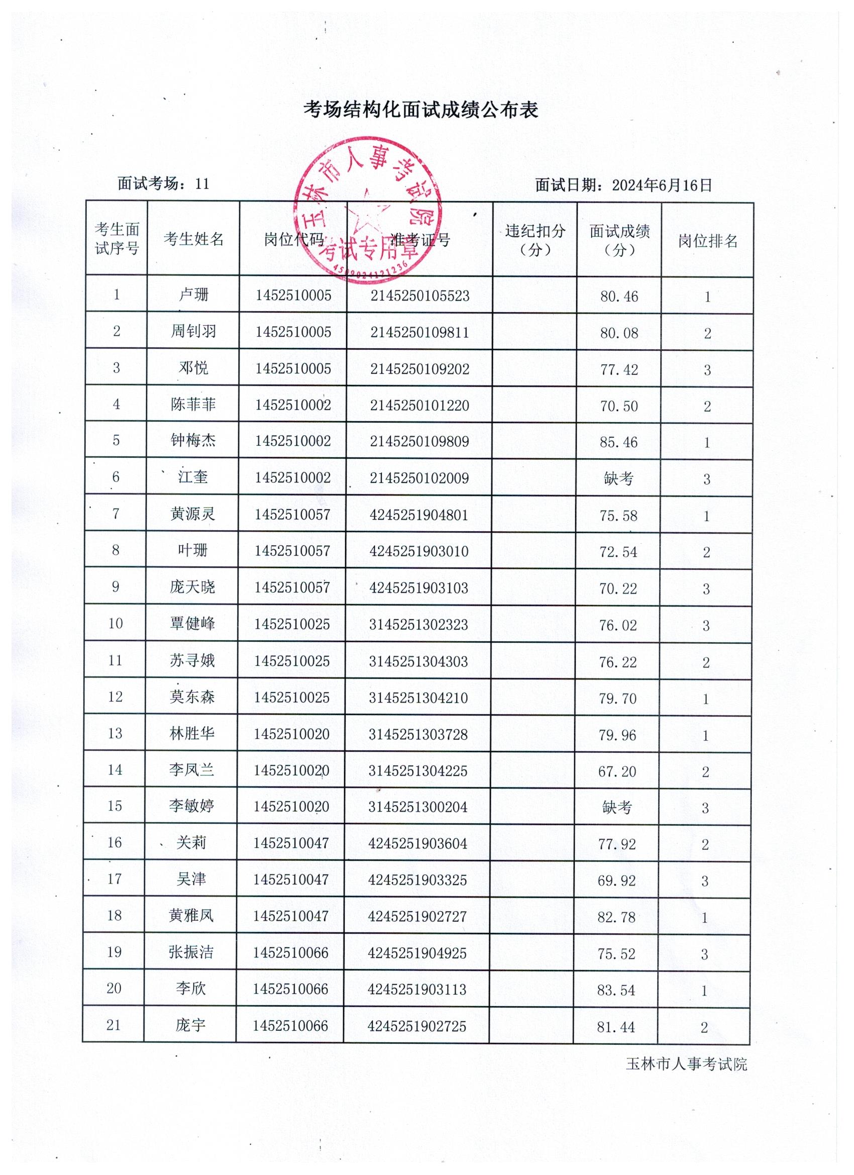 原文標題:2024年玉林市直(含玉州區、福綿區、玉東新區)事業(yè)單位公開(kāi)招聘人員面試成績(jì)公布(6月16日)