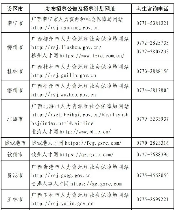 具體事宜可進(jìn)入廣西“三支一扶”網(wǎng)(http://szyf.gxrc.com)查詢(xún)政策或向各市“三支一扶”辦公室電話(huà)咨詢(xún)。