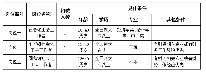 (五)具有全日制大專(zhuān)以上文化程度,年齡18-40周歲,性別不限;崗位一專(zhuān)業(yè)必須為經(jīng)濟學(xué)類(lèi)、會(huì )計學(xué)類(lèi)、審計類(lèi)專(zhuān)業(yè);崗位二、崗位三專(zhuān)業(yè)不限,同等條件下,有財務(wù)相關(guān)專(zhuān)業(yè)或有財務(wù)工作經(jīng)驗優(yōu)先;