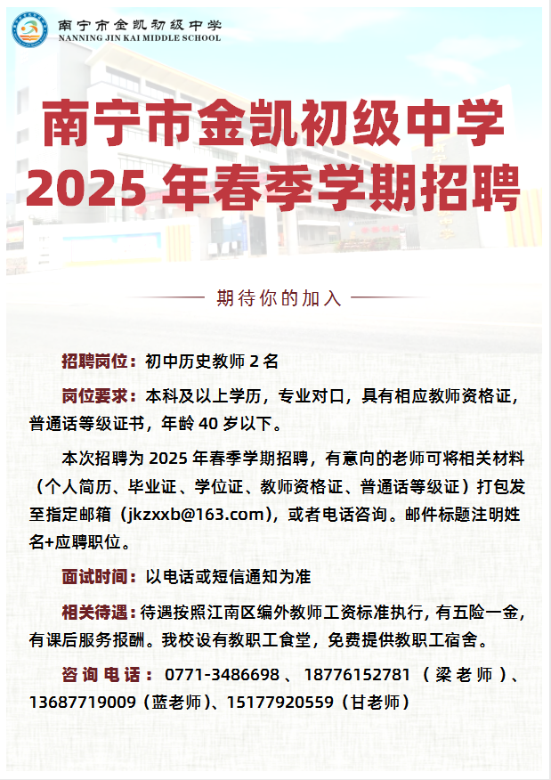 原文標題:南寧市金凱初級中學(xué)2025年春季學(xué)期招聘