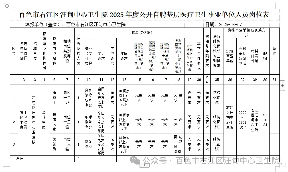 附:右江區汪甸中心衛生院2025年度公開(kāi)自聘基層醫療衛生事業(yè)單位人員崗位表