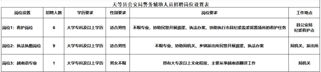 附件1:天等縣公安局警務(wù)輔助人員招聘崗位設置表