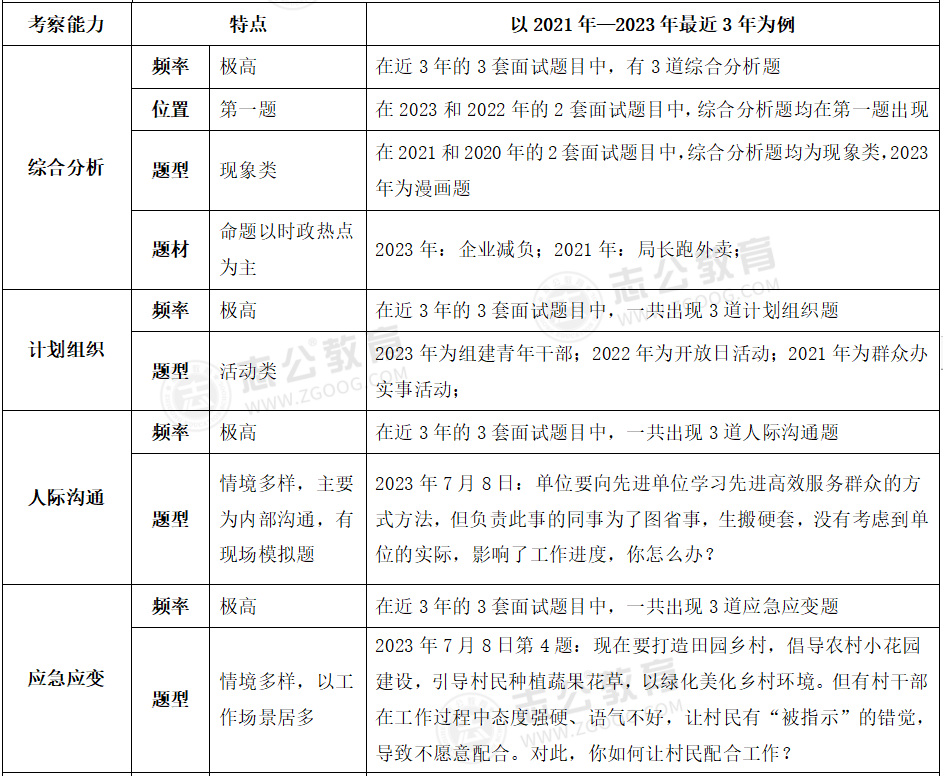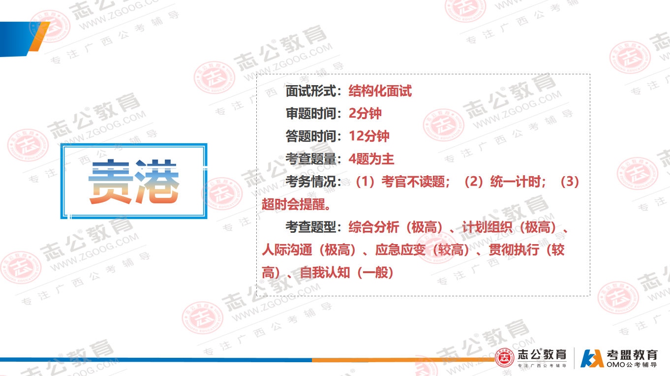 貴港事業(yè)單位面試主要采用結構化面試形式;審題時(shí)間:2分鐘;答題時(shí)間:12分鐘;考查題量:4題為主??紕?wù)情況:考官不讀題、統一計時(shí)、超時(shí)會(huì )提醒??疾轭}型:綜合分析(極高)、計劃組織(極高)、人際溝通(極高)、應急應變(較高)、貫徹執行(較高)、自我認知(一般)。