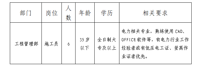 要求服務(wù)意識強,辦事穩重,作風(fēng)扎實(shí),服從工作安排、身體健康,具備崗位專(zhuān)業(yè)要求。具體招聘崗位及招聘條件如下表: