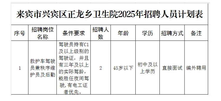來(lái)賓市興賓區正龍鄉衛生院2025開(kāi)招聘非醫學(xué)類(lèi)編外工作人員2人