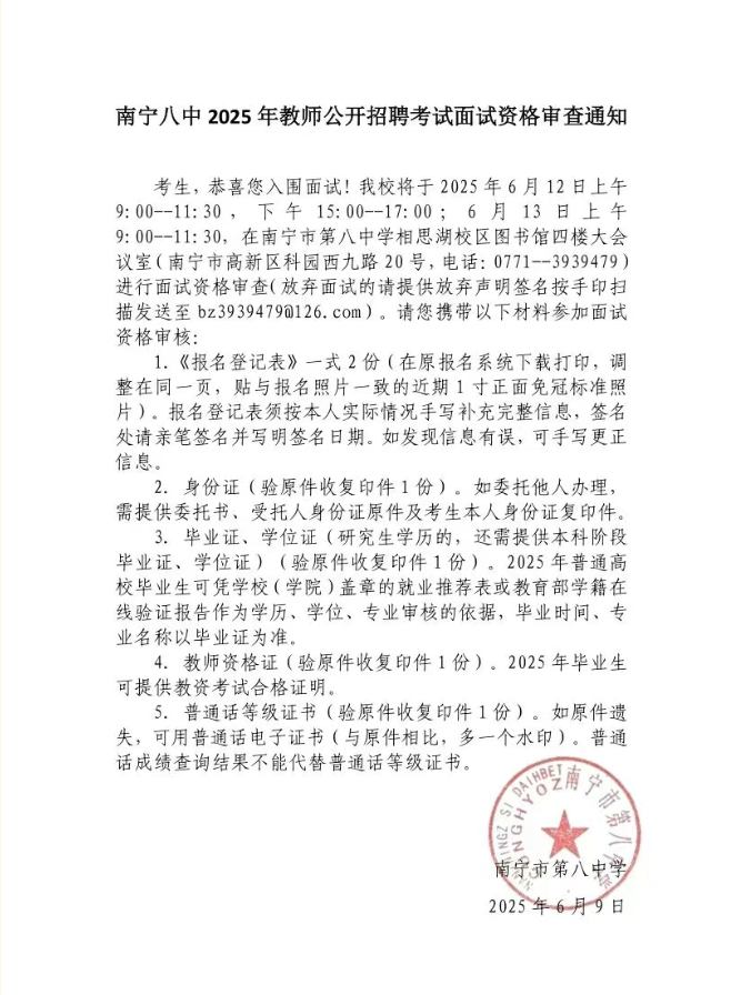 南寧八中2025年教師公開(kāi)招聘考試面試資格審查通知