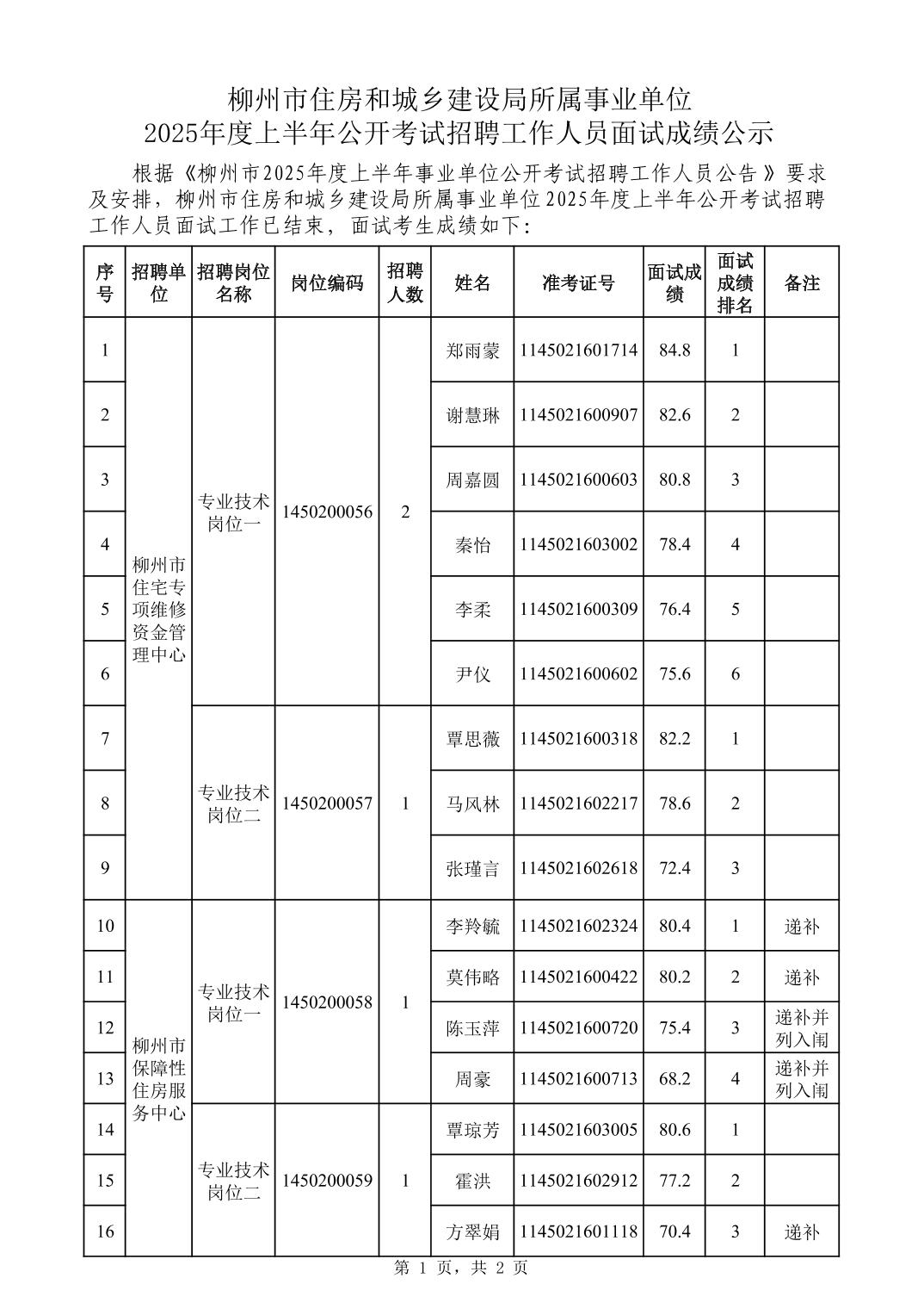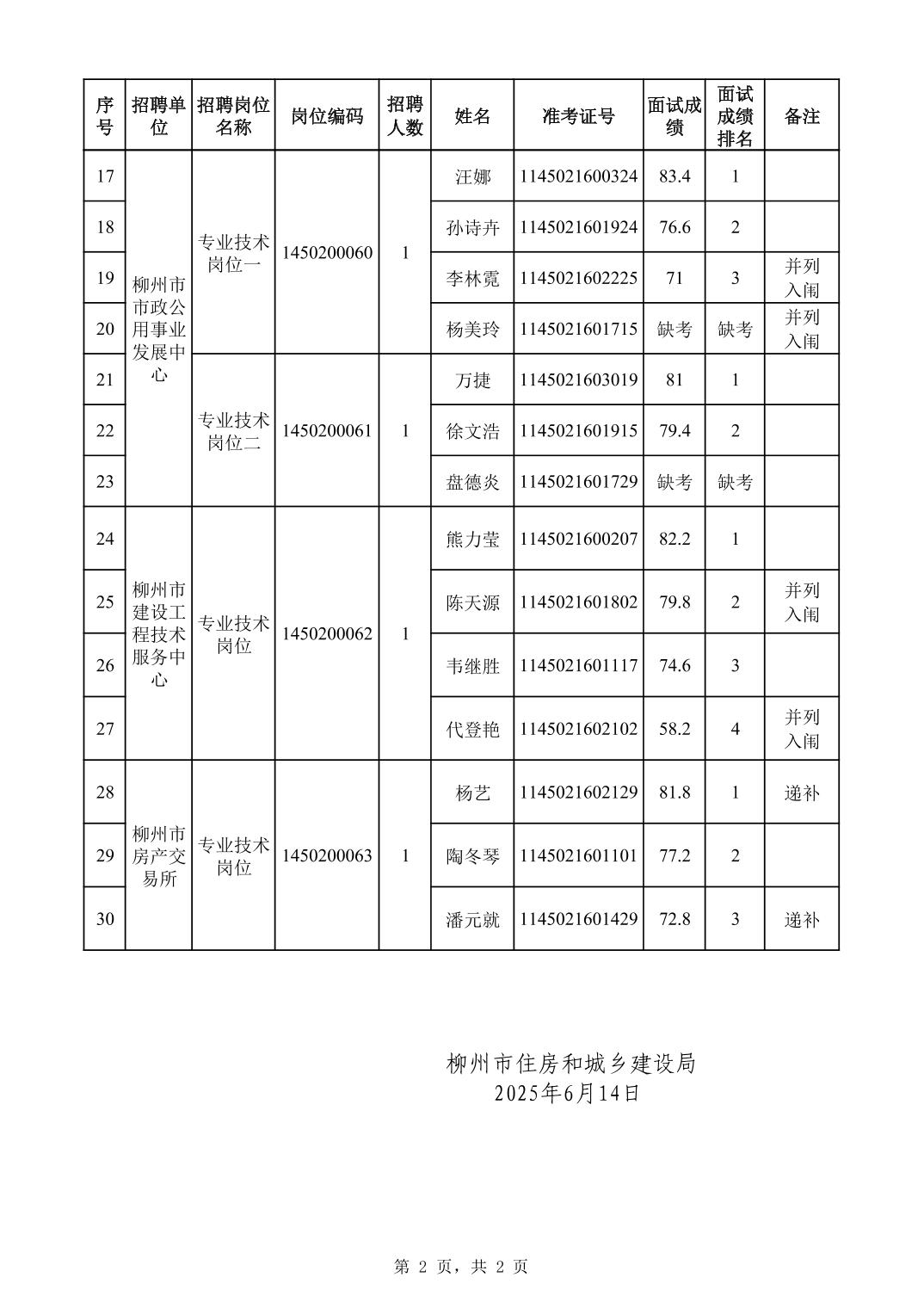 柳州市住房和城鄉建設局所屬事業(yè)單位2025年度上半年公開(kāi)考試招聘工作人員面試成績(jì)公示