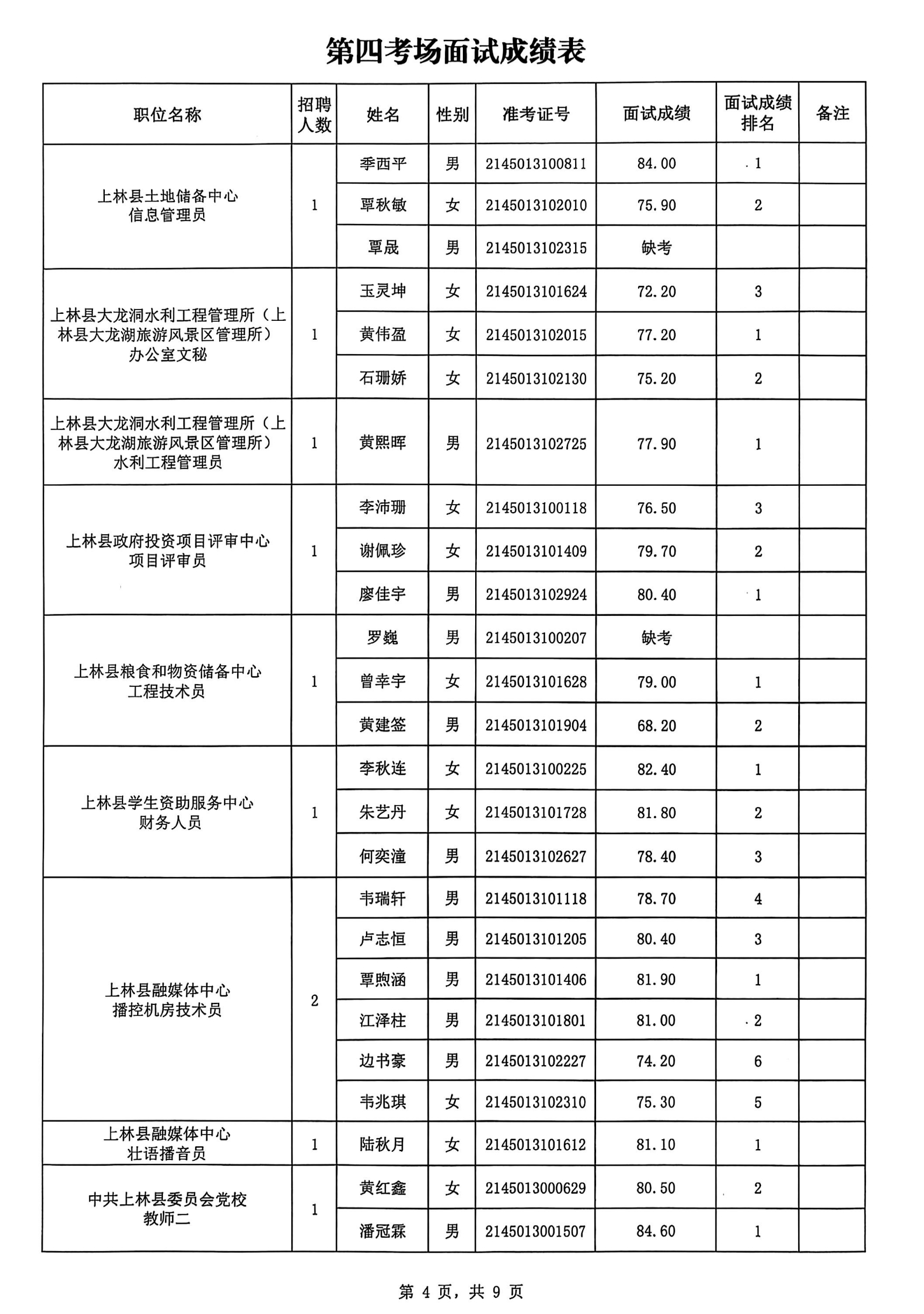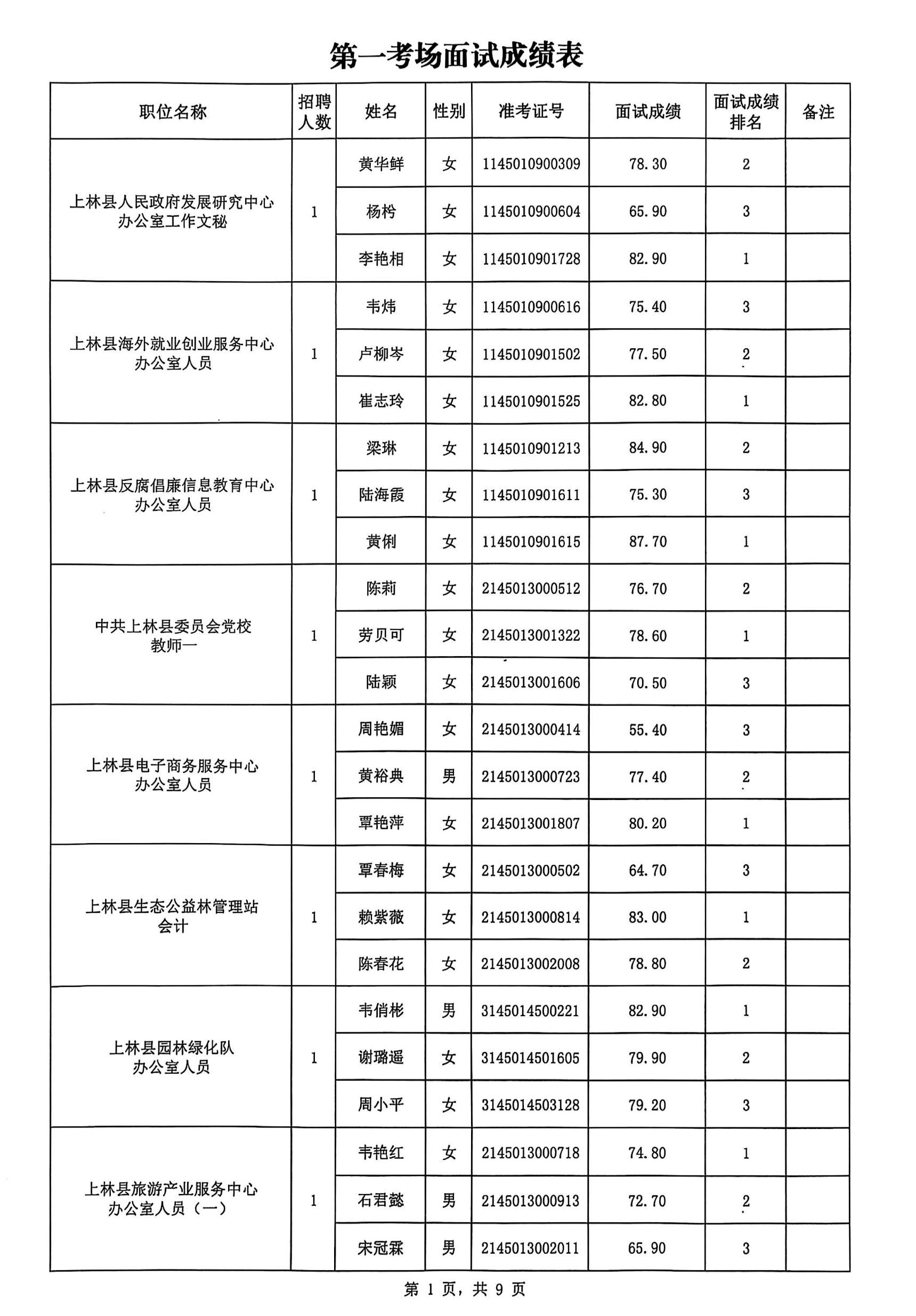 上林縣2025年公開(kāi)考試招聘事業(yè)單位工作人員面試成績(jì)