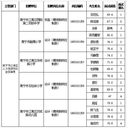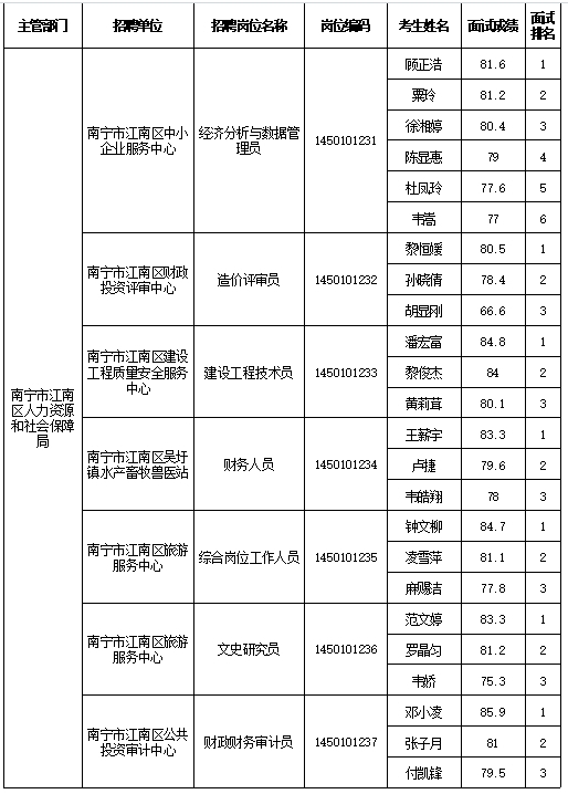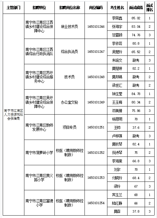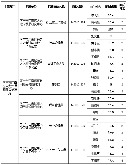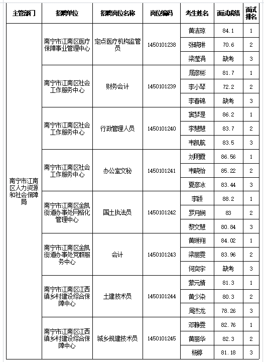 原文標題:南寧市江南區人力資源和社會(huì )保障局2025年公開(kāi)考試招聘事業(yè)單位工作人員面試成績(jì)表