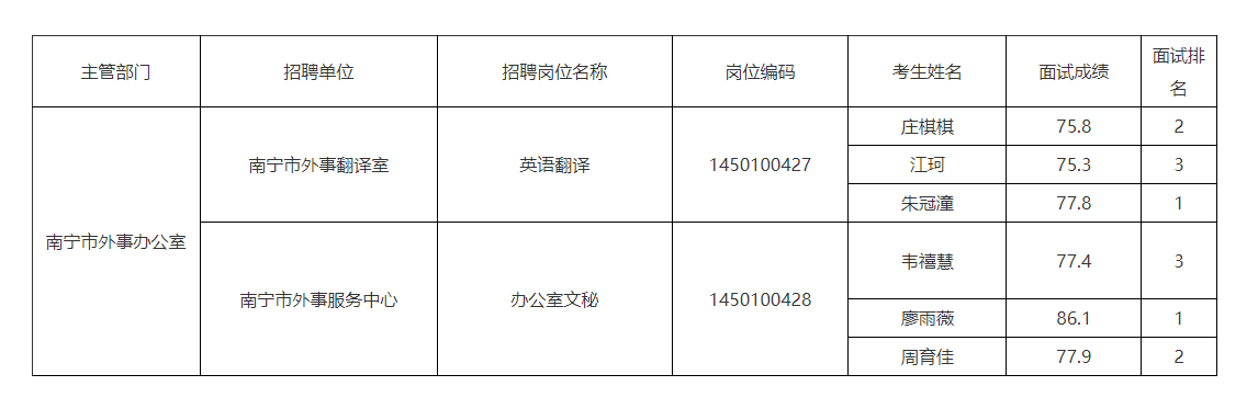 南寧市外事辦公室2025年公開(kāi)考試招聘事業(yè)單位工作人員面試成績(jì)表