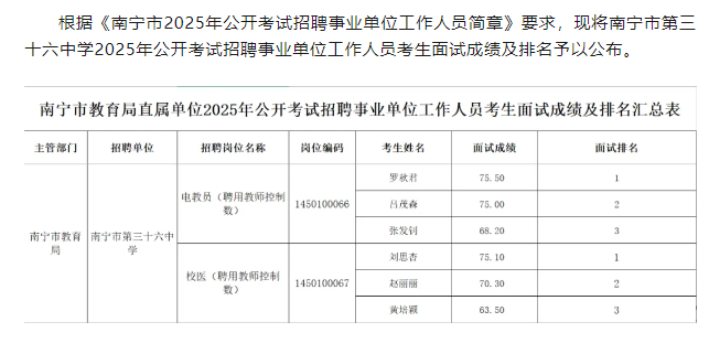南寧市教育局關(guān)于公布南寧市第三十六中學(xué)2025年公開(kāi)考試招聘事業(yè)單位工作人員考生面試成績(jì)及排名的公告
