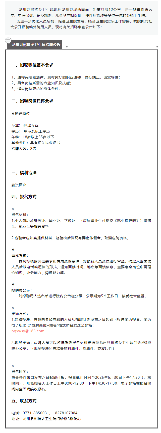 原文標題:龍州縣彬橋鄉衛生院招聘公告