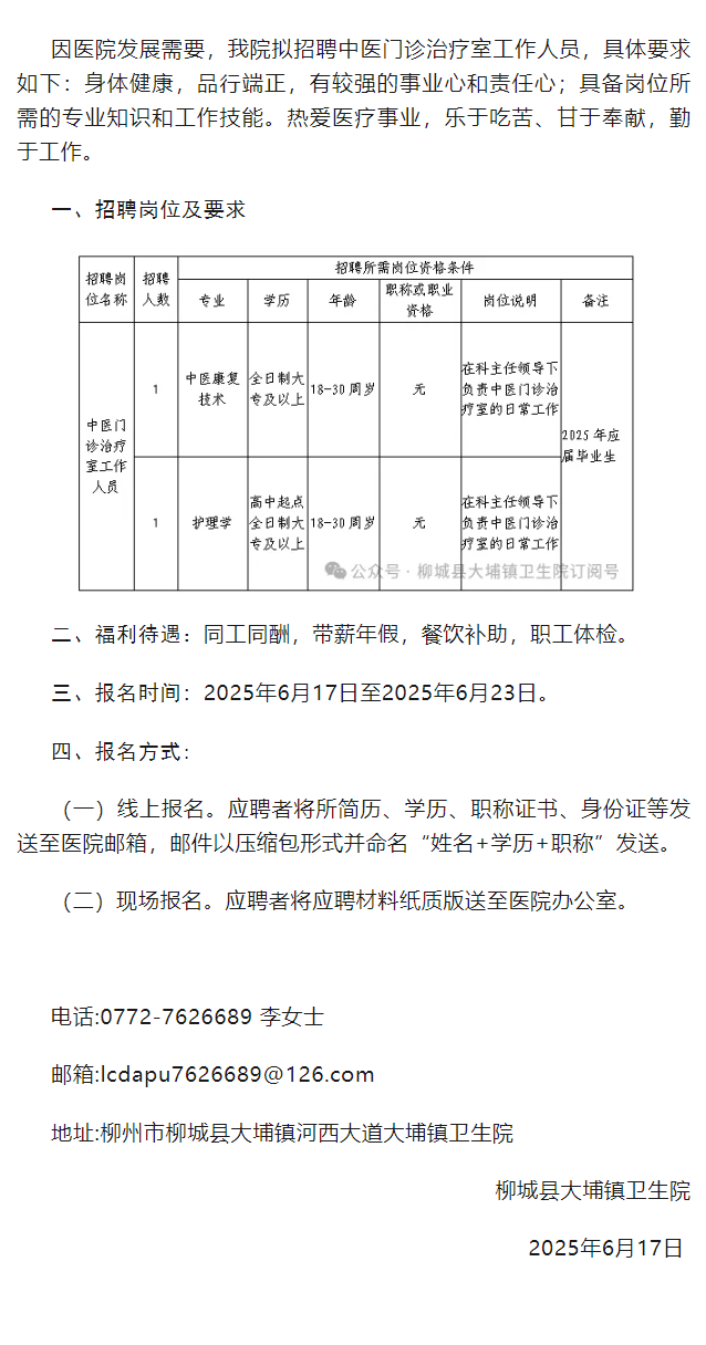 柳城縣大埔鎮衛生院中醫門(mén)診治療室工作人員招聘2人