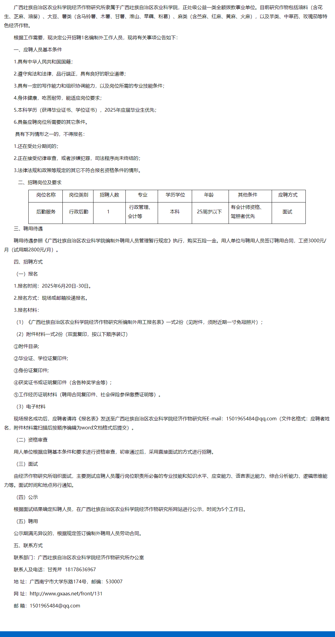 2025年廣西壯族自治區農業(yè)科學(xué)院經(jīng)濟作物研究所招聘編制外工作人員1人
