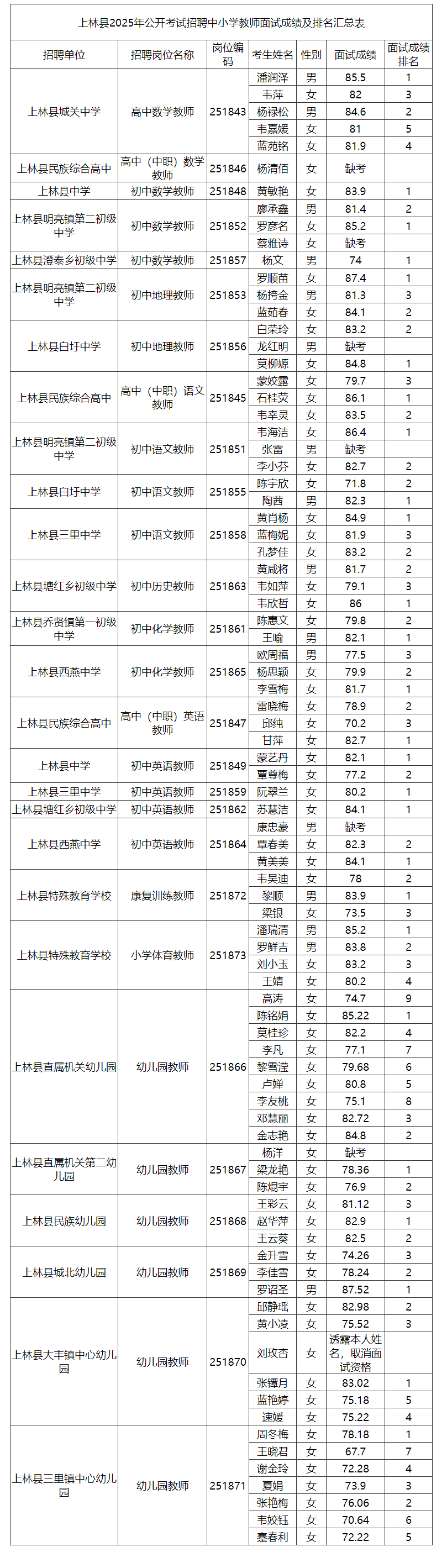 上林縣2025年公開(kāi)考試招聘中小學(xué)教師面試成績(jì)及排名公告