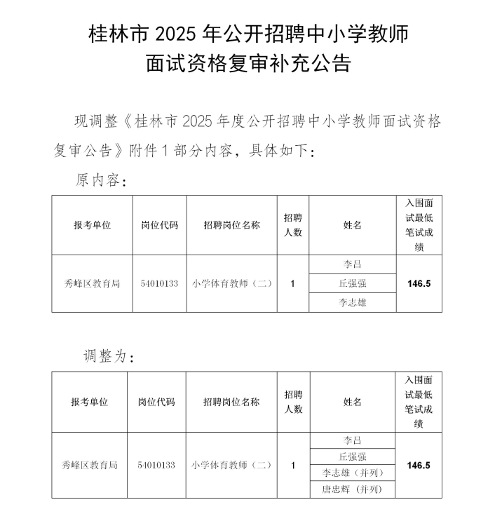 桂林市2025年公開(kāi)招聘中小學(xué)教師面試資格復審補充公告