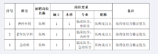 根據醫院發(fā)展需要,現面向社會(huì )急招神經(jīng)外科、老年醫學(xué)科、急診科醫師,有關(guān)招聘事項公告如下: