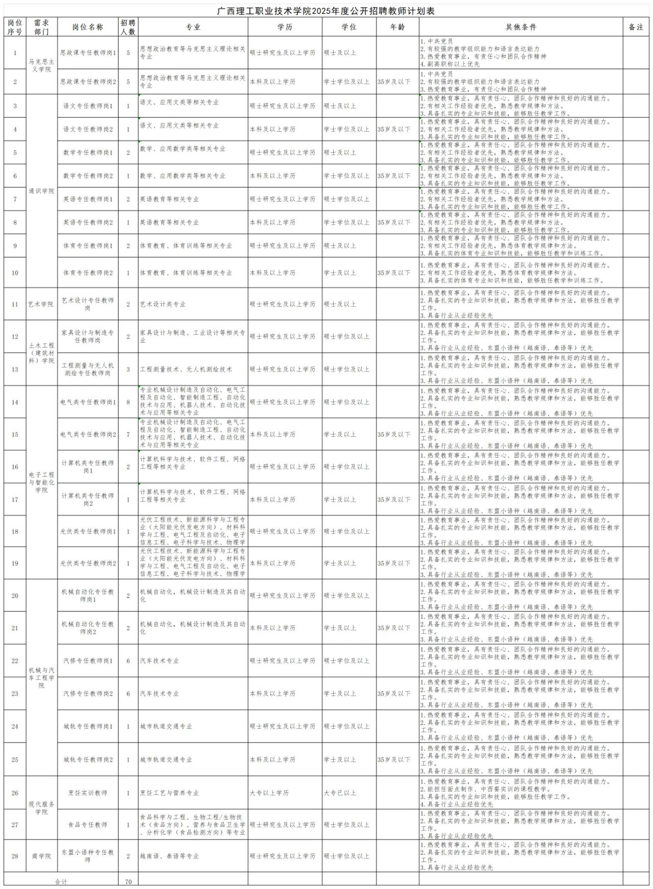 詳見(jiàn)《廣西理工職業(yè)技術(shù)學(xué)院2025年度公開(kāi)招聘教師計劃表》