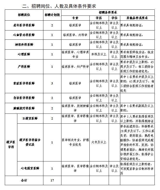 注:初中級職稱(chēng)應聘人員原則上年齡要求為35周歲及以下;如為副高以上職稱(chēng),年齡可放寬至45周歲;學(xué)歷層次高者優(yōu)先。醫師崗位中如要求具有規培證條件的是指已取得規培合格證書(shū)(含通過(guò)規培結業(yè)考試未領(lǐng)合格證書(shū))或已取得中級及以上職稱(chēng)人員。