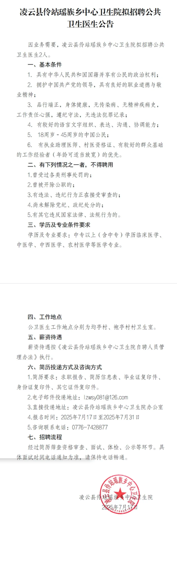 2025年凌云縣伶站瑤族鄉中心衛生院擬招聘公共衛生醫生2人