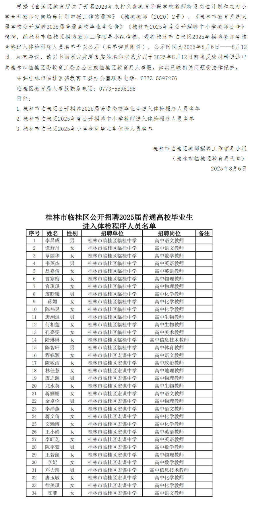 桂林市臨桂區2025年招聘教師考核合格進(jìn)入體檢程序人員名單公示