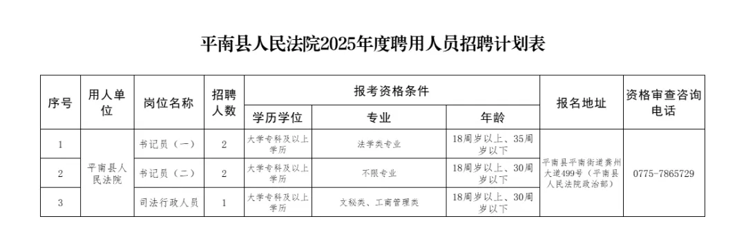 本次招聘崗位為書(shū)記員4名,司法行政人員1名。詳見(jiàn)附件1《平南縣人民法院2025年度聘用人員招聘計劃表》(以下簡(jiǎn)稱(chēng)《招聘計劃表》)。