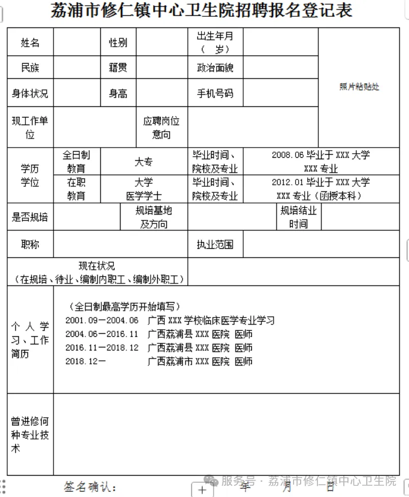 4.現場(chǎng)報名須知:請將簡(jiǎn)歷投遞至荔浦市修仁鎮建北街287號,荔浦市修仁鎮中心衛生院院辦公室。