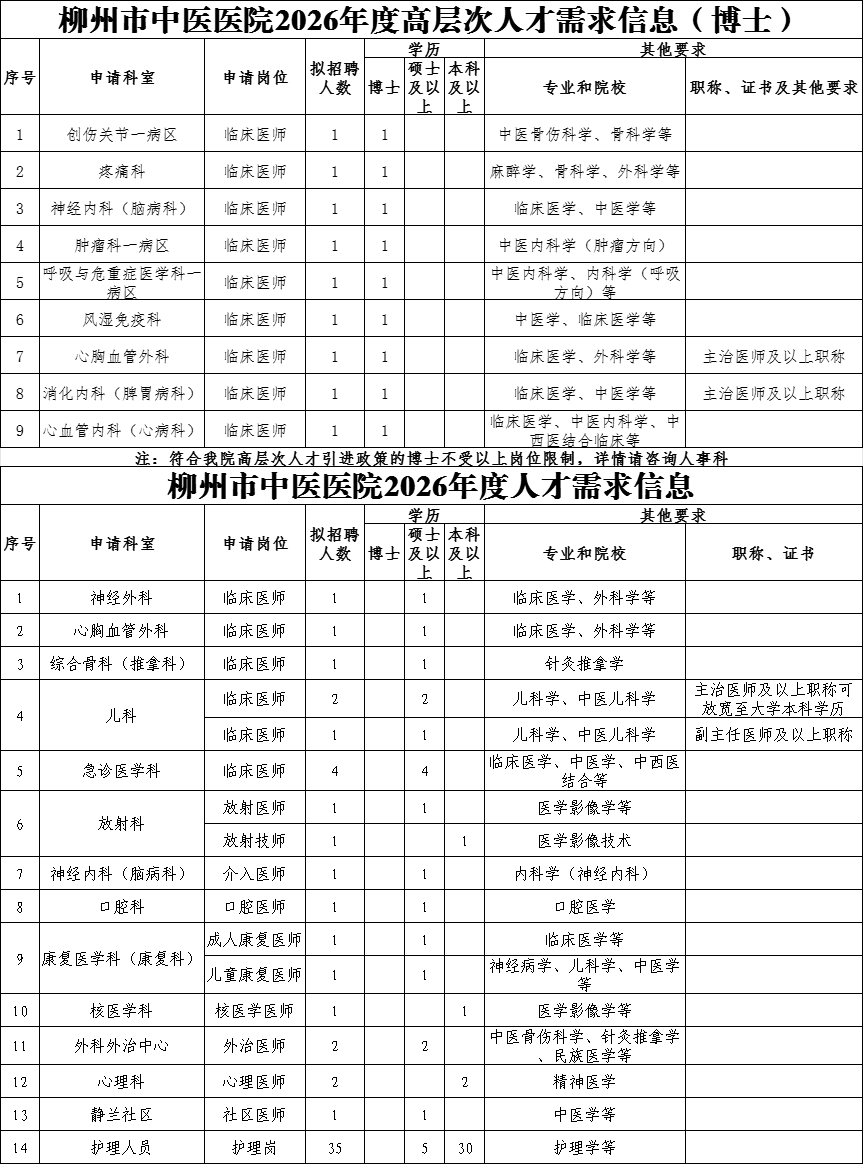 高層次人才不受招聘崗位限制,均可一事一議、一人一議。高層次人才(博士)根據醫院引進(jìn)人才制度,給予25萬(wàn)-120萬(wàn)元安家費、5萬(wàn)-20萬(wàn)元科研啟動(dòng)經(jīng)費。引進(jìn)的高層次人才(高級職稱(chēng)或博士研究生)按柳州市有關(guān)政策提供事業(yè)編制,協(xié)助其解決子女入學(xué)和配偶工作。2026年醫學(xué)類(lèi)緊缺人才擬招聘醫師7人,緊缺人才科室為心理科(精神衛生專(zhuān)業(yè))、神經(jīng)外科、急診醫學(xué)科,擬享受柳州市中醫醫院人才引進(jìn)醫學(xué)類(lèi)緊缺人才安家費2-20萬(wàn)元,同時(shí)按照國家、廣西壯族自治區、柳州市及醫院有關(guān)政策享受工資及福利待遇,獎勵性績(jì)效工資按照醫院同級同類(lèi)人員規定執行。如為學(xué)科帶頭人或高層次人才則另按其標準享受相關(guān)待遇。