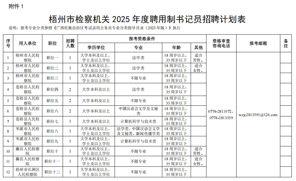 詳見(jiàn)《梧州市檢察機關(guān)2025年度聘用制書(shū)記員招聘計劃表》(附件1)。