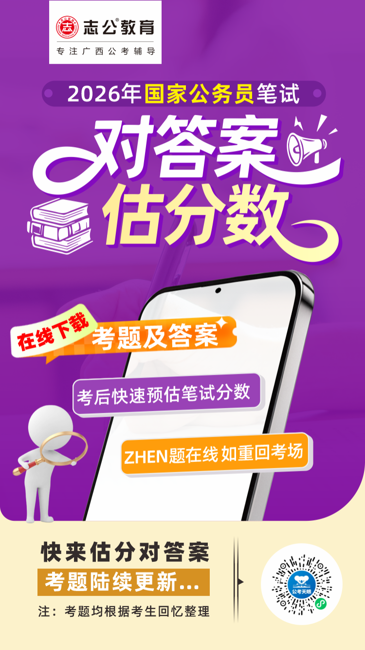 剛走下考場(chǎng)?志公教育為廣西考生整理了2026國考筆試考及答案在線(xiàn)下載服務(wù),推出在線(xiàn)估分平臺,助你快速預估分數。